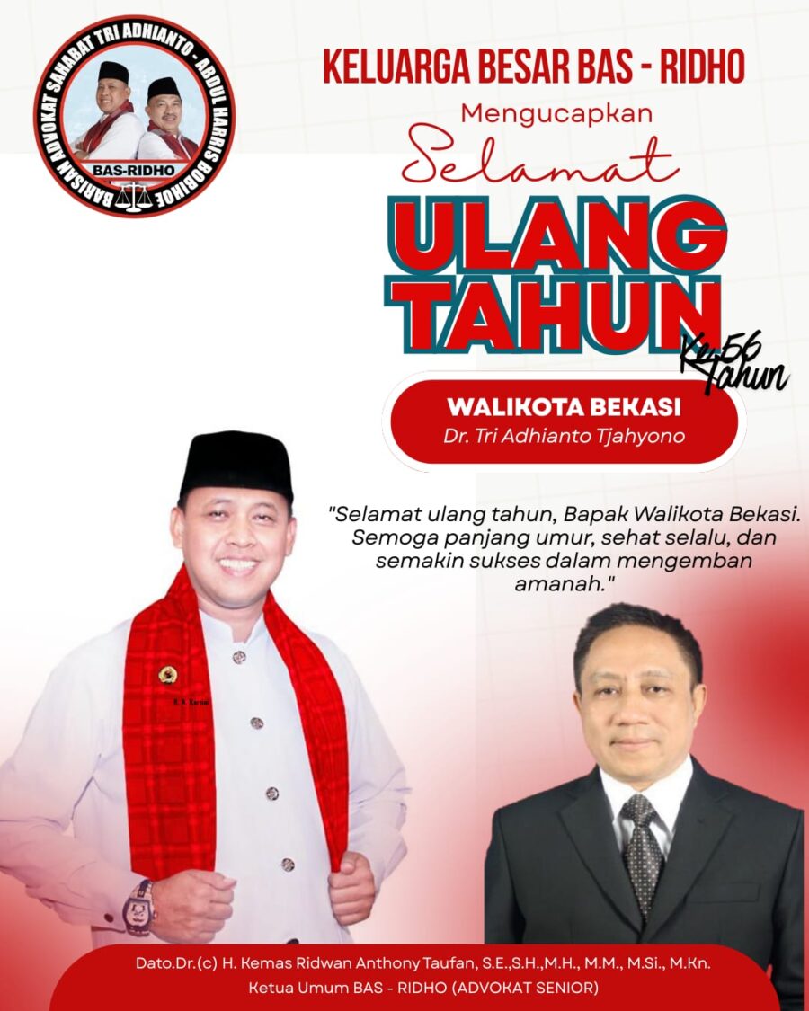 Jakarta, Jelajah.co – Praktisi hukum senior yang juga Ketua Umum Barisan Advokat Sahabat Tri Adhianto dan Abdul Harris Bobihoe, Dato. Dr. (c) H. Kemas Ridwan Anthony Taufan, S.E., S.H., M.H., M.H., M.Si., M.Kn., menyampaikan ucapan selamat ulang tahun ke-56 kepada Wali Kota Bekasi.