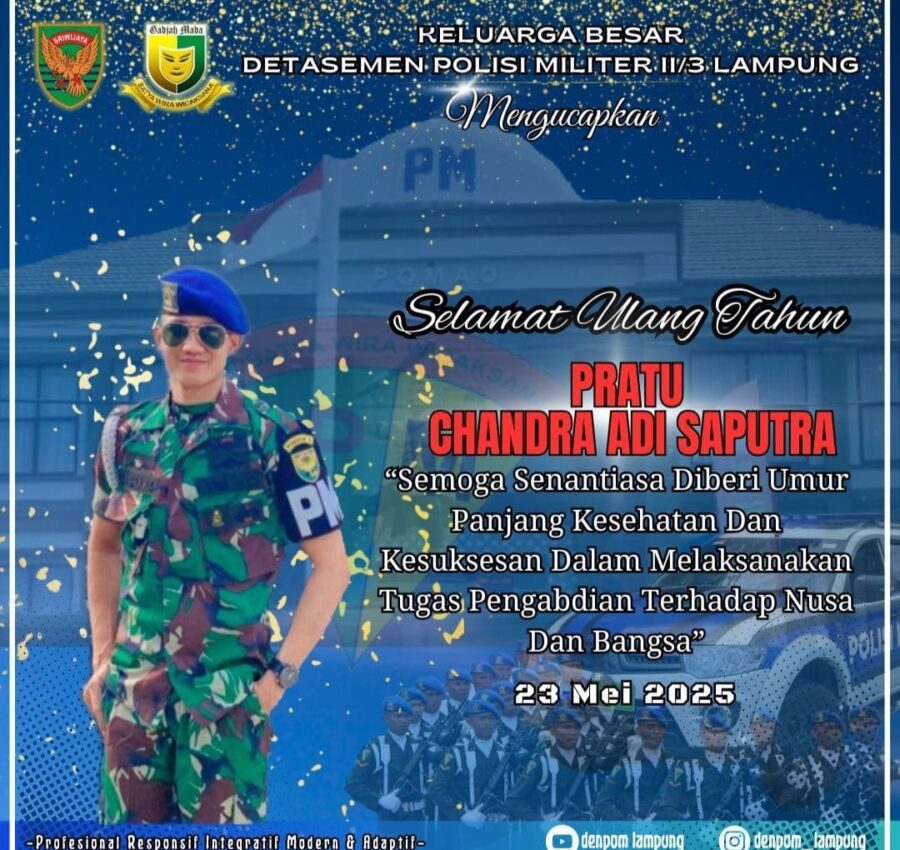 “Atas nama keluarga besar AWPI Way Kanan, kami mengucapkan selamat ulang tahun kepada Pratu Chandra Adi Saputra. Semoga selalu diberikan perlindungan oleh Tuhan Yang Maha Esa, senantiasa sehat, kuat, dan sukses dalam pengabdiannya kepada negara,” ujar Agus, Jumat (23/05/25).