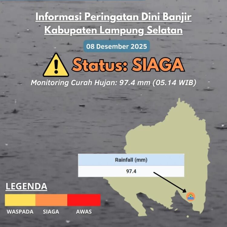 BMKG menetapkan status siaga untuk Lampung Selatan sebagai langkah antisipasi terhadap potensi banjir dan gangguan hidrometeorologi lainnya apabila hujan masih berlanjut. Sejumlah kecamatan diminta meningkatkan kewaspadaan, di antaranya Kalianda, Rajabasa, Penengahan, Ketapang, Bakauheni, termasuk kawasan pesisir serta dataran rendah di sekitarnya.