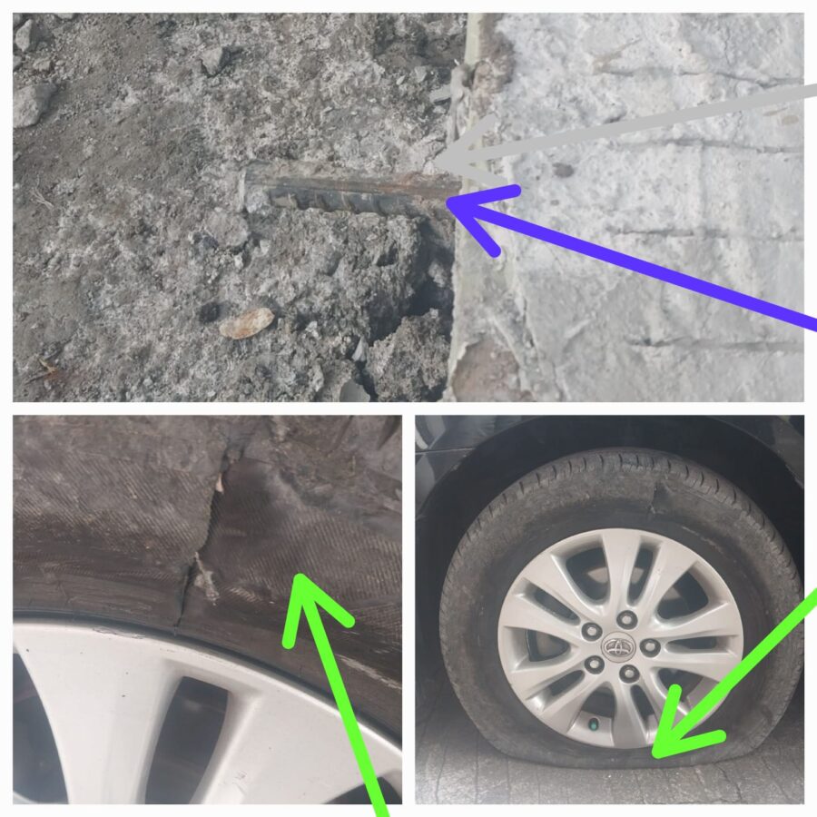 Akibatnya, dua mobil di laporkan mengalami kerusakan ban setelah melintas karna akses jalan padat dan baru separo yang di kerjakan. Ban kendaraan tersebut pecah diduga terkena ujung besi samping coran yang mencuat kepermukaan jalan.